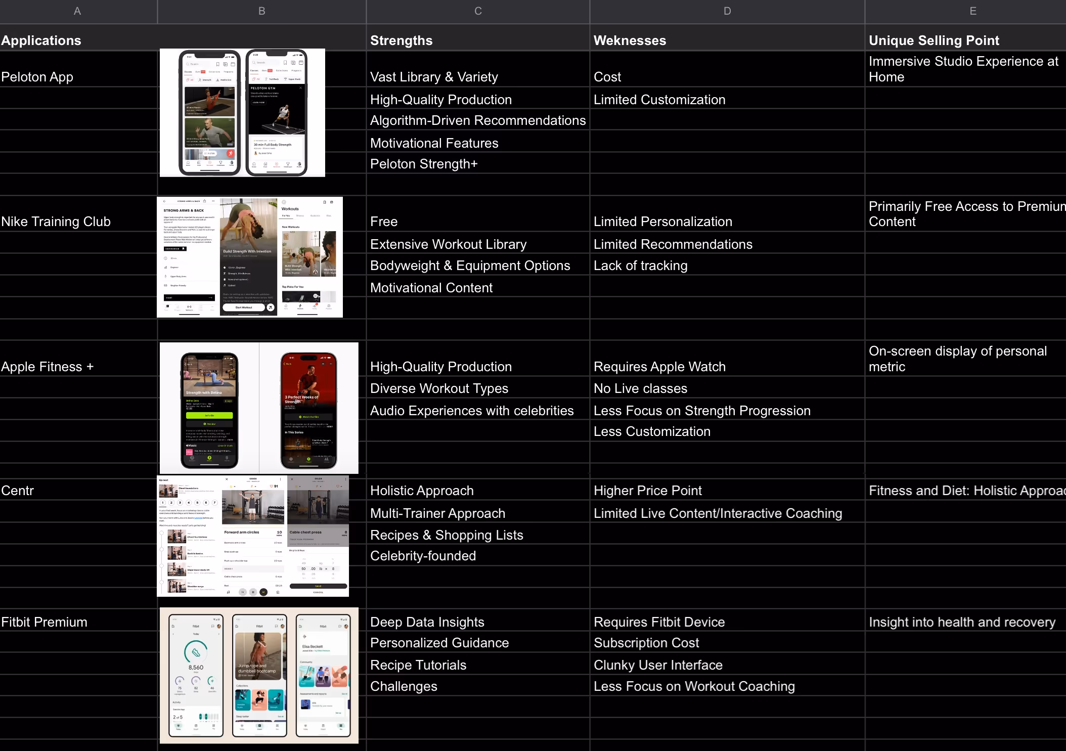 Going into the project, I was aware of the saturated market when it comes to applications and websites for fitness and exercising. Thanks to our small team, together we were able to conduct some tests into the products of our competitors. We analyzed several popular applications that are most similar to ours. We looked at celebrity-backed tools and already well-established applications from Apple & Fitbit. This was an early point of reflection on what our competitors are doing well, their USPs, and the pain points users of these applications are facing that we could solve through our product. For this, things like app store reviews came in handy. Amongst different design and efficiency problems, we learned about the lack of speedy exercise discovery, which turned fitness novices away from using fitness applications. I saw this as the largest gap in the market and an opportunity for us to step in and help users build fitness routines faster, this way drawing more people to our application.